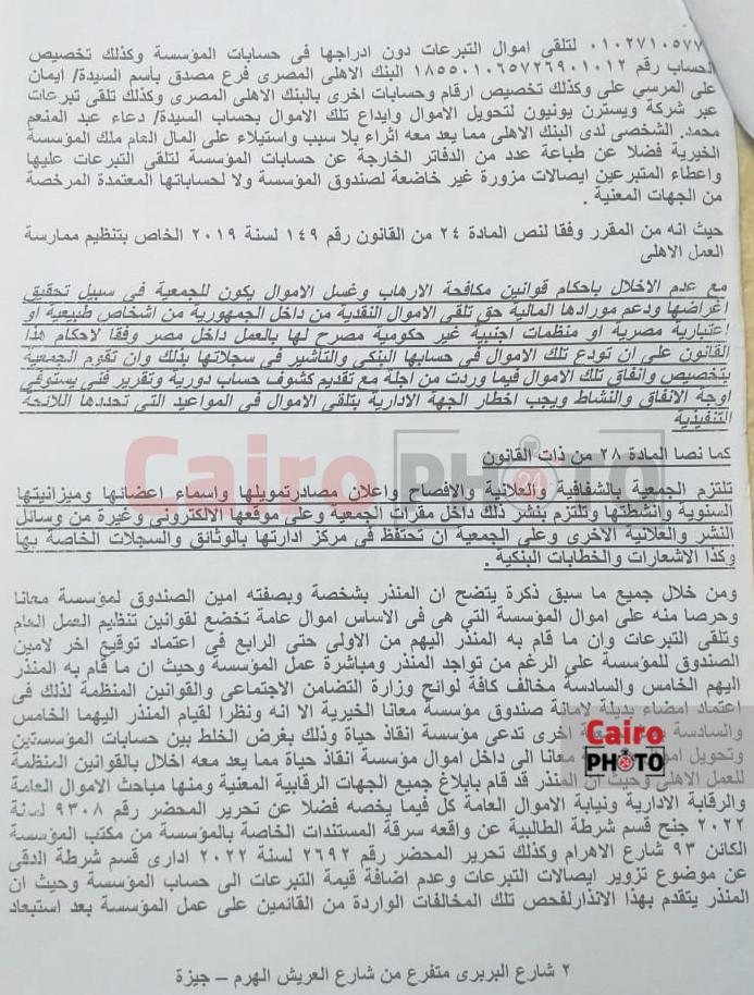 وأشار إلى أنه حرر محضر رقم 9308 لسنة 2022 جنح قسم شرطة الطالبية عن واقعة سرقة المستندات الخاصة بالمؤسسة من مكتب المؤسسة الكائن 93 شارع الأهرام، وكذلك تحرير المحضر رقم 2692 لسنة 2022 إداري قسم شرطة الدقي عن موضوع تزوير إيصالات التبرعات، وعدم إضافة قيمة التبرعات إلى حساب المؤسسة.