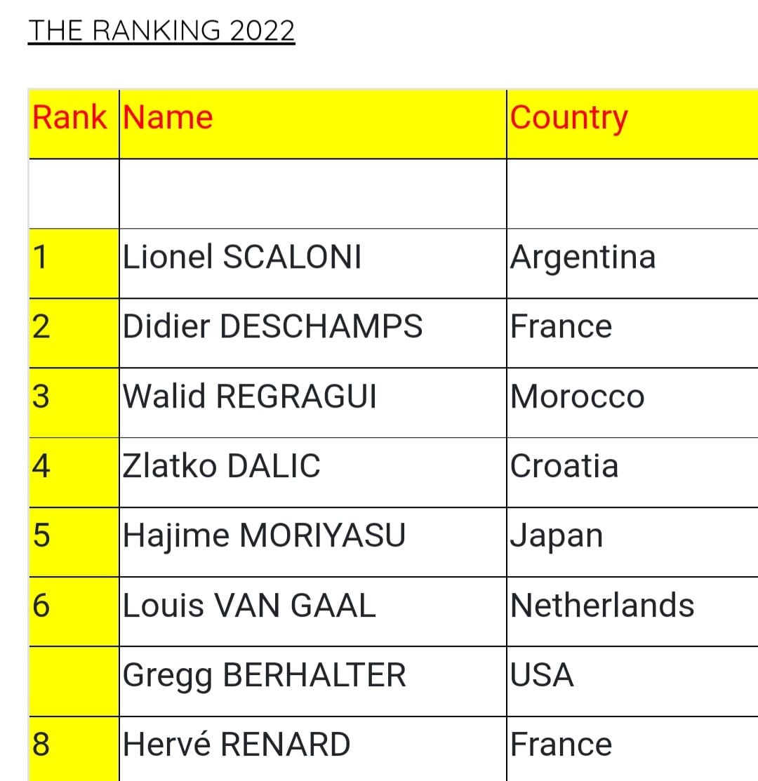 وحصل سكالوني، على جائزة أفضل مدرب في العالم بعد تتويجه بلقب كأس العالم قطر 2022 مع منتخب الأرجنتين، بينما تواجد المدرب الفرنسي ديديه ديشامب في المركز الثاني، واحتل وليد الركراكي المدير الفني لمنتخب المغرب المركز الثالث، وجاء الكرواتي داليتش في المركز الرابع.