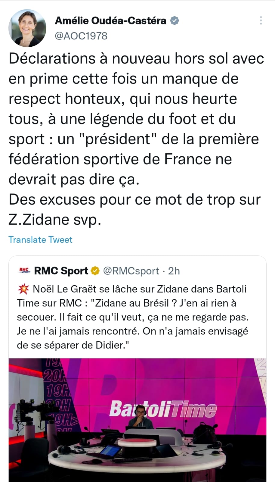 كما دافعت أميلي أوديا كاستيرا، وزيرة الرياضة الفرنسية، عن زين الدين زيدان، حيث كتبت عبر حسابها الرسمي على إحدى مواقع التواصل الاجتماعي تويتر: تصريحات من جديد خارج النص، تصريحات تجرحنا جميعًا بحق زيدان أسطورة كرة القدم والرياضة، رئيس الاتحاد الفرنسي للرياضة الأولى بفرنسا لا يجب أن يقول هذا.. يجب أن يكون هناك اعتذارات لزين الدين زيدان.