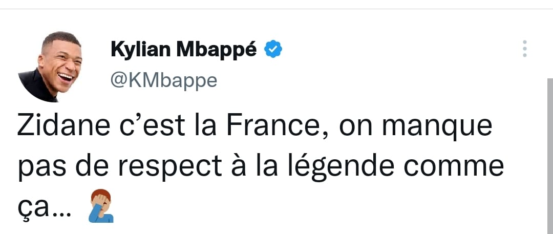 ودافع كيليان مبابي نجم نادي باريس سان جيرمان ومنتخب فرنسا عن زين الدين زيدان، حيث قال عبر حسابه الرسمي على إحدى مواقع التواصل الاجتماعي تويتر: زي الدين زيدان هو فرنسا، نحن لا نحترم الأساطير هكذا.