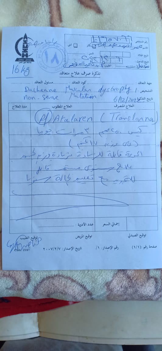 وأضاف والد الطفل عمر أحمد، خلال حديثه لـ القاهرة 24، أنه بدأ باستشارة الأطباء حول حالة نجل، وعلم أنه مصابًا بمرض ضمور العضلات دوشين - الطفرة الهرائية، والتي تستجيب لعلاج ترانسلارنا المستورد Translarna، ورغم أنه يبدو وكأنه باب أمل فُتح أمامه، إلا أن سعر العلاج وقف عائقًا، حيث وصل ثمن العلبة إلى 125 ألف جنيه، ووفقًا لحالة عمر فهو يحتاج شهريًا لمبلغ يُقدر بـ 375 ألف جنيه.