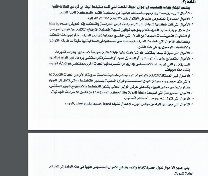 ويختص الجهاز بإدارة والتصرف في أموال الدولة الخاصة التي آلت ملكيتها إليها، في أي من الحالات الآتية:-