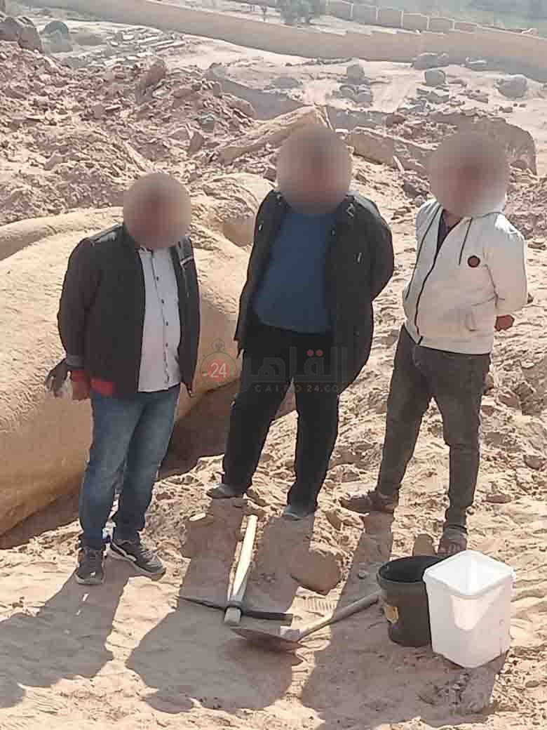 عقب إجراء التحريات المكثفة؛ تم استهدافهم وأمكن ضبط 3 أشخاص، لأحدهم معلومات جنائية، حال قيامهم بالحفر بالمنطقة المشار إليها، وتم العثور على حفر غير منتظم الشكل حول التمثال، بقصد محاولة تحريكه تمهيدًا لمحاولة نقله خارج المنطقة، وتم اتخاذ الإجراءات القانونية.