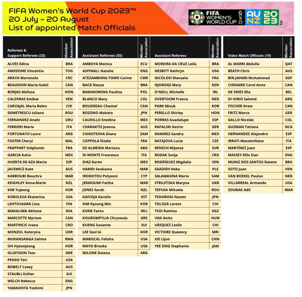 ونشر الاتحاد الدولي لكرة القدم فيفا بيانا رسميا قال فيه: أعلنت لجنة حكام فيفا اليوم أسماء حكام المباريات المختارين لكأس العالم للسيدات FIFA أستراليا ونيوزيلندا 2023، بتواجد 33 حكما و55 حكما مساعدا و19 حكما على الفيديو وتم اختيارهم بالتعاون الوثيق مع الاتحادات القارية الستة، بناءً على جودة الحكام والأداء الذي تم تقديمه في بطولات FIFA وكذلك في المسابقات الدولية والمحلية الأخرى في السنوات الأخيرة، ولأول مرة في تاريخ كأس العالم للسيدات فيفا، تم اختيار ست نساء من VMOs.