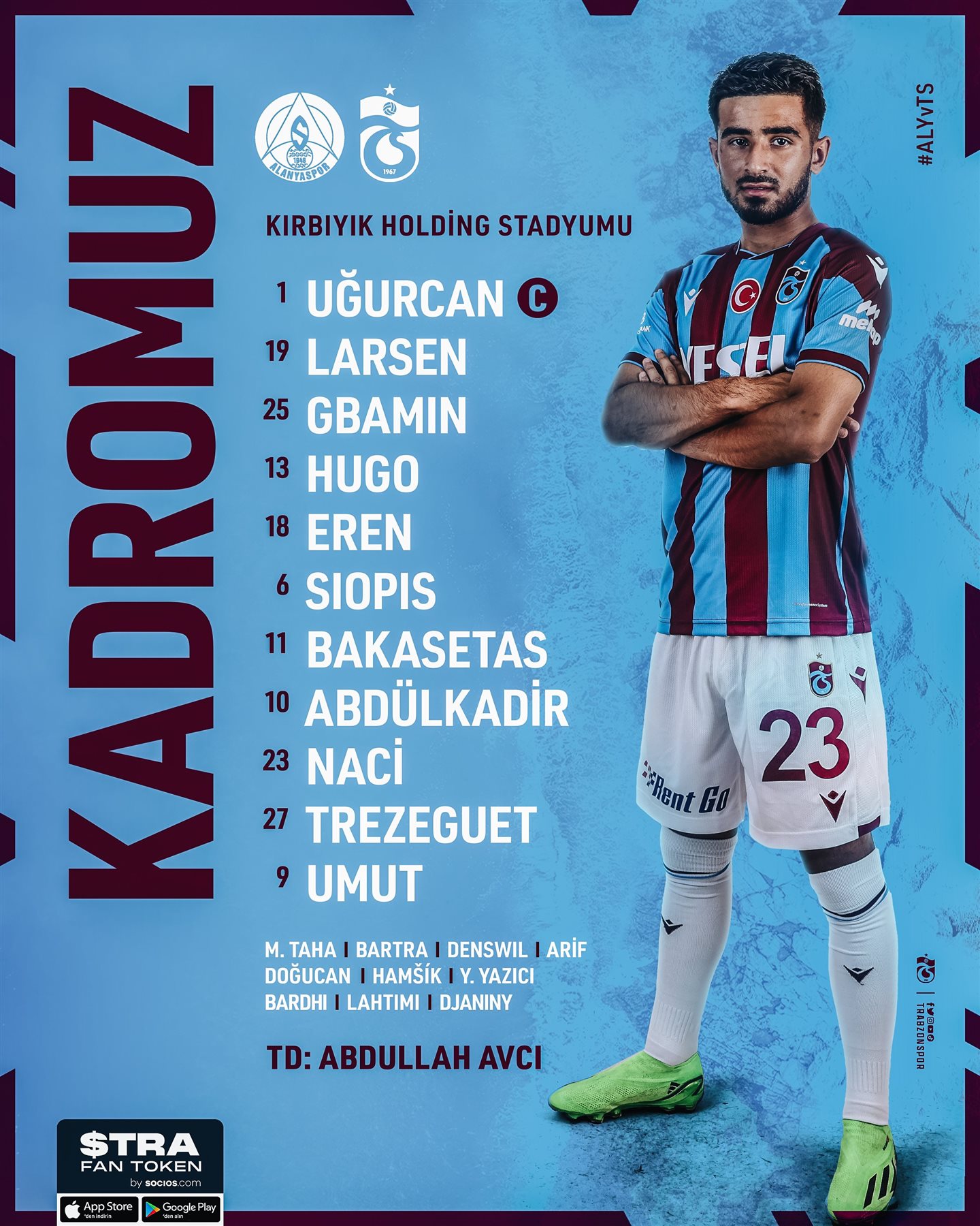 أعلن عبد الله افجي المدير الفني لفريق طرابزون سبور، التشكيل الرسمي لمواجهة نظيره فريق ألانيا سبور ضمن منافسات مسابقة الدوري التركي الممتاز.