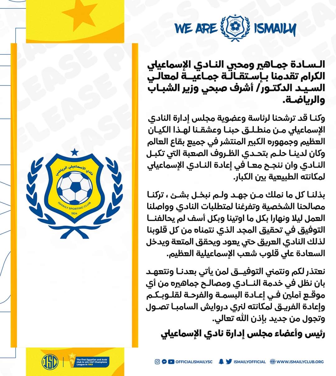 السادة جماهير ومحبي النادي الإسماعيلي الكرام تقدمنا باستقالة جماعية لمعالي السيد الدكتور / أشرف صبحي وزير الشباب والرياضة.