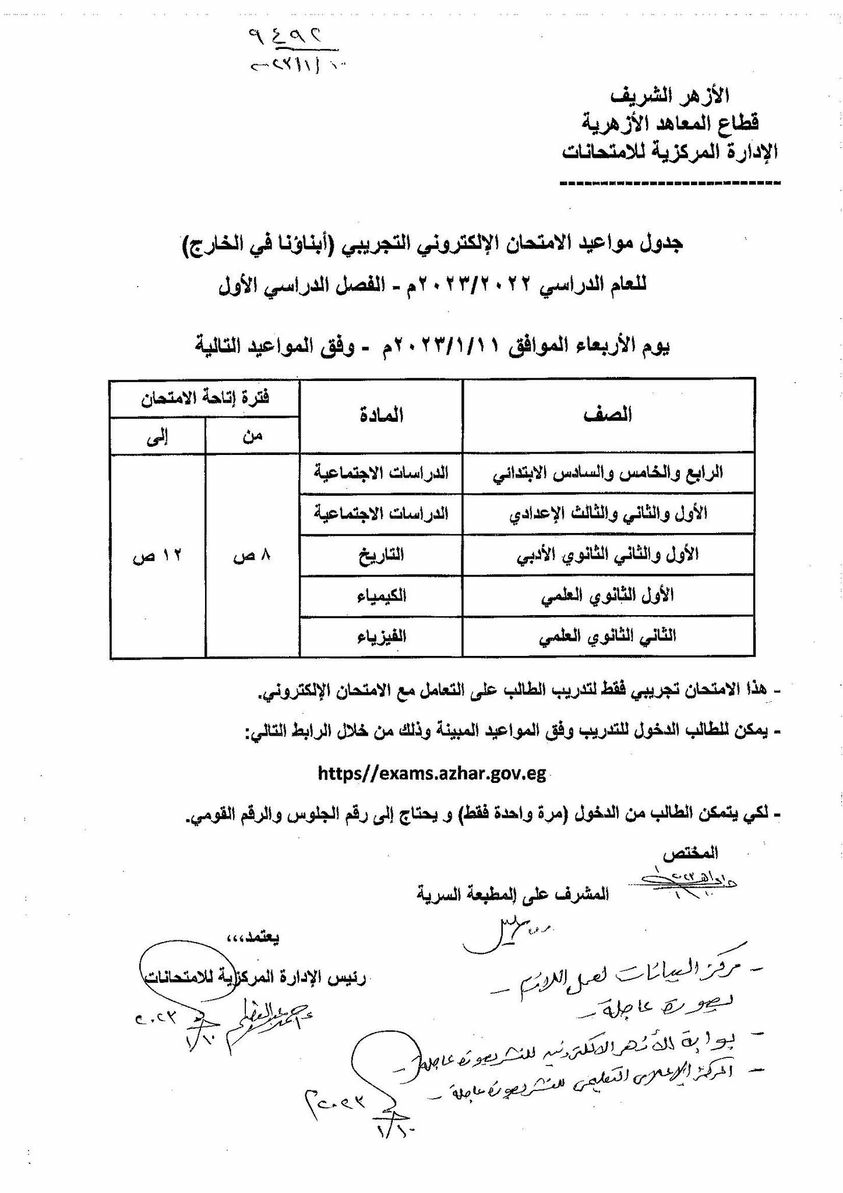 على جانب آخر، اعتمد الشيخ أيمن عبد الغني رئيس قطاع المعاهد الأزهرية جداول وتعليمات امتحانات أبناؤنا في الخارج، وذلك من الصف الأول الابتدائي حتى الصف الثاني الثانوي، حيث عرضها على رئيس القطاع، الشيخ أحمد عبد العظيم محمد رئيس الإدارة المركزية للامتحانات بقطاع المعاهد الأزهرية.