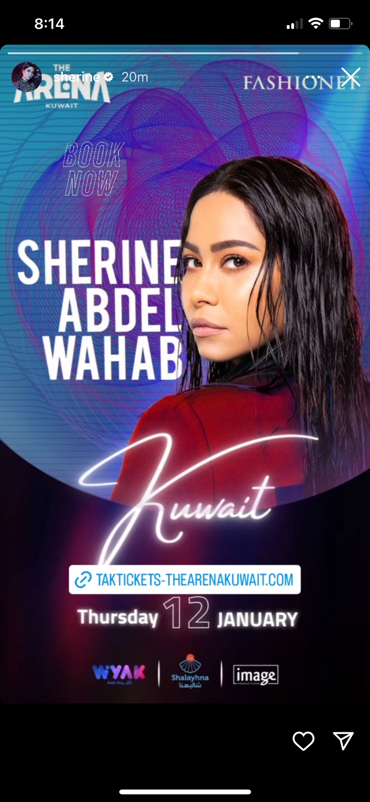 وأعلنت شيرين عبد الوهاب من خلال البوستر الذي نشرته على ستوري خاص بـ حسابها الشخصي على إنستجرام، بأن موعد حفلها يوم 12 يناير المقبل، وتجاهلت أزمتها الأخيرة والتي كانت في لبنان بعد مقابلة الفنان فضل شاكر في مخيم عيون الحلوة.