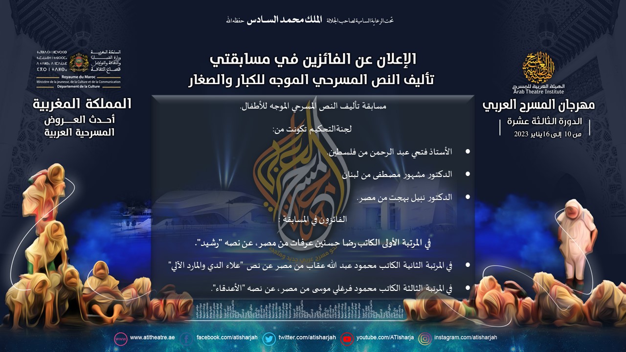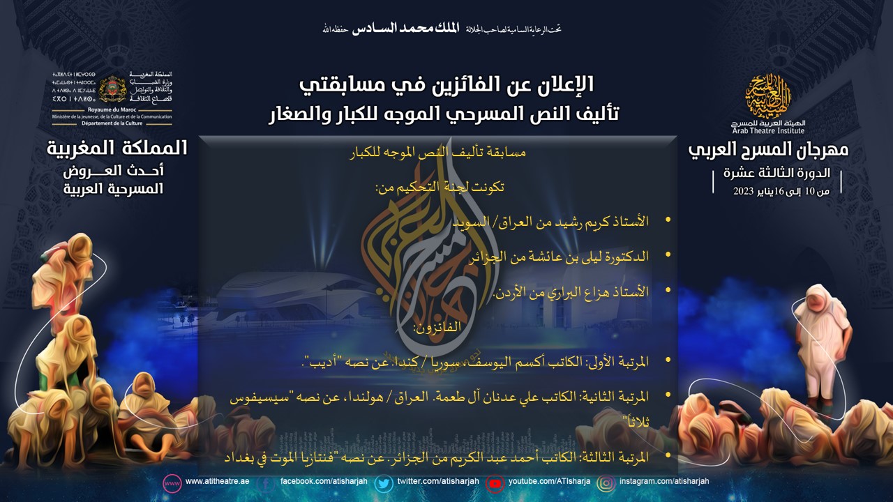 أعلن مهرجان المسرح العربي بالدار البيضاء في الدورة الثالثة عشر خلال حفل الافتتاح الذي أقيم اليوم الثلاثاء، النتائج النهائية للفائزين في مسابقتي تأليف النص المسرحي سواء الموجه للكبار أو الصغار والذين وصل عددهم إلى العشرين شخص.