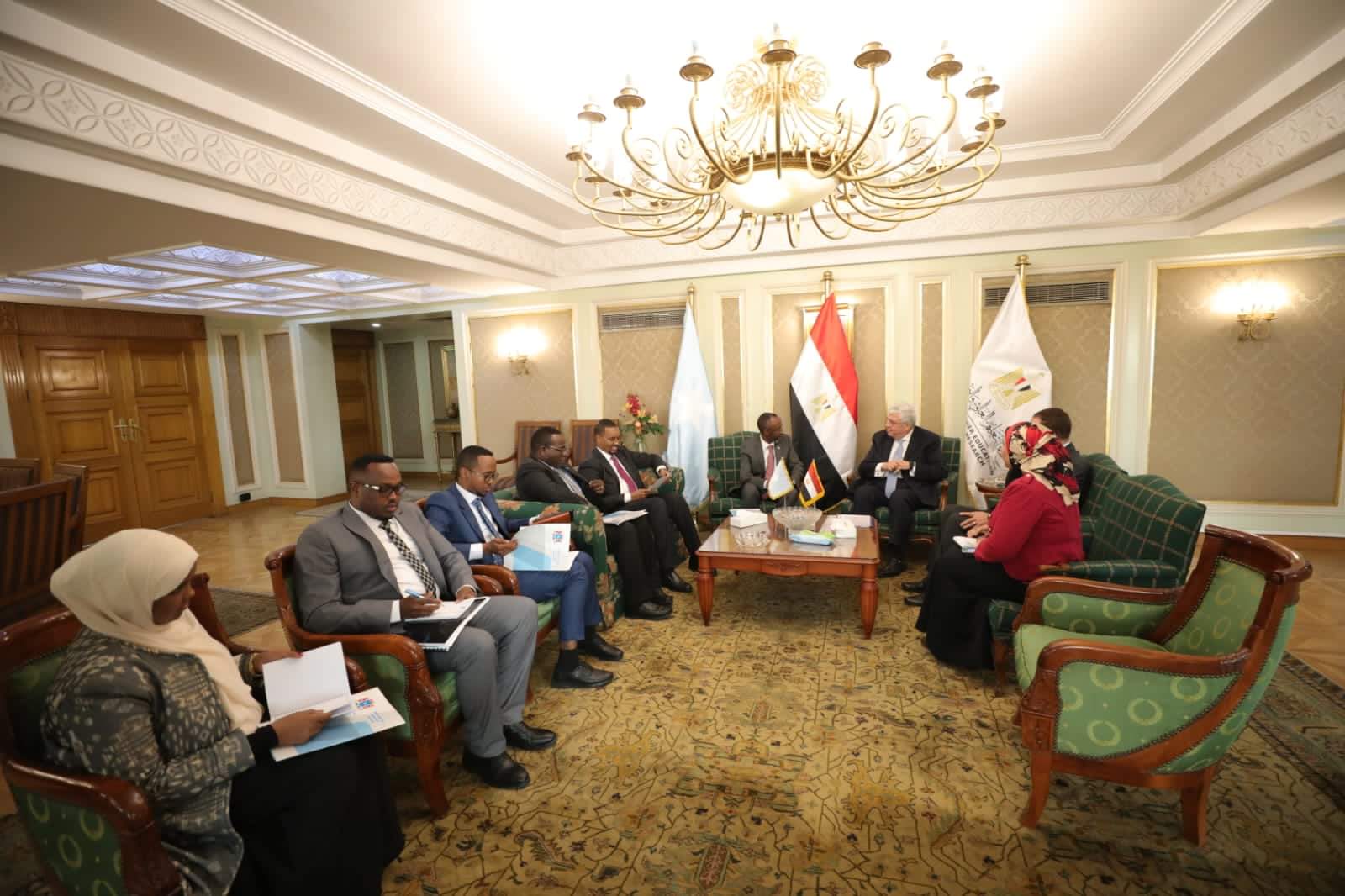 وتناول اللقاء؛ بحث آليات التعاون العلمي والبحثي بين الجامعات المصرية والصومالية، من خلال تقديم الخدمات التعليمية للطلاب، وأعضاء هيئة التدريس، وتبادل الخبرات حول أحدث البرامج التدريبية والمناهج الدراسية وطرق التدريس، فضلًا عن التعاون في المشروعات البحثية بمجالات الزراعة والطاقة المُتجددة، بالإضافة إلى التعاون في مجال المُتغيرات المناخية.