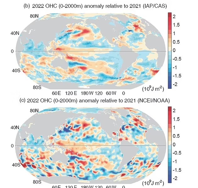 وفقًا للبيانات كانت الحرارة الموجودة في أعلى 2000 متر من المحيط مرتفعة عن العام الماضي، حيث يبلغ متوسط عمق المحيطات في العالم حوالي 3688 مترًا، لذا فإن الجزء العلوي 2000 متر يشكل غالبية عمق المحيط، ومع ذلك يعتقد أن العمق الذي يقل عن 2000 متر أيضًا يتأثر.