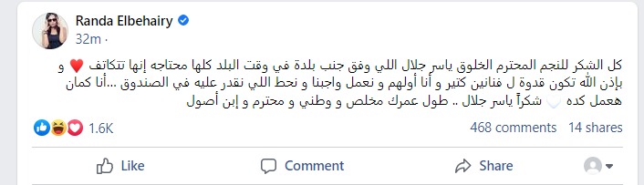 وكتبت الفنانة راند البحيري رسالة شكر لـ الفنان ياسر جلال لتبرعه بـ 3 ملايين جنيه لصندوق تحيا مصر، وذلك من خلال حسابها الشخصي بموقع التواصل الاجتماعي فيس بوك: كل الشكر للنجم المحترم الخلوق ياسر جلال اللي وقف جنب بلدة في وقت البلد كلها محتاجة إنها تتكاتف.