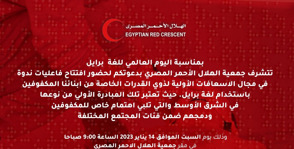 أعلنت جمعية الهلال الأحمر المصري، التابعة لإشراف وزارة التضامن الاجتماعي، إطلاق مبادرة هي الأولى من نوعها في الشرق الأوسط، في مجال الإسعافات الأولية للأشخاص من ذوي الإعاقة المكفوفين، باستخدام لغة برايل.