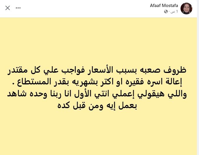 وكتبت عفاف مصطفى، منشورًا عبر حسابها الشخصي بموقع فيسبوك، جاء فيه: ظروف صعبة بسبب الأسعار، فواجب على كل مُقتدر إعالة أسرة فقيرة أو أكثر بشهريه بقدر المستطاع.