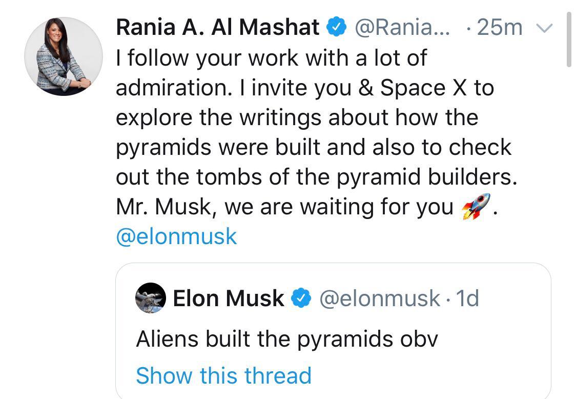 جدير بالذكر أن المشاط كانت قد ردت على تغريدة للملياردير الأمريكي، إيلون ماسك عام 2020، حيث صرح رئيس شركة سبيس إكس، المتخصصة في تقنيات استكشاف الفضاء، بأنه من مؤيدي نظرية أن مخلوقات فضائية شاركت في جهود البناء الضخمة للأهرامات؛ وهو ما دفع الوزيرة رانيا المشاط لدعوته لزيارة البلاد.