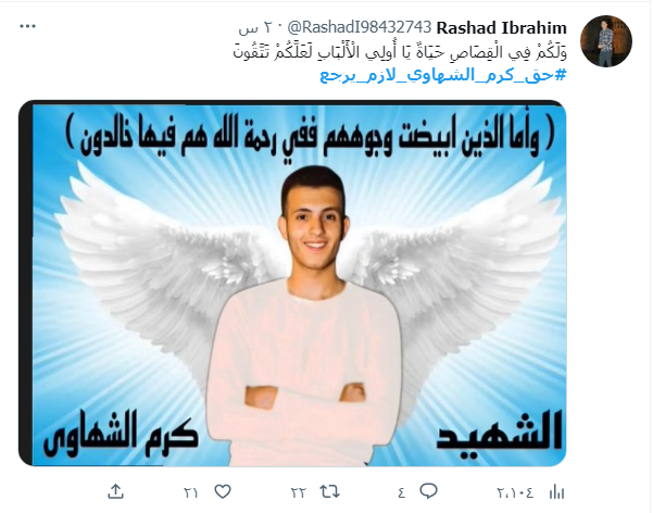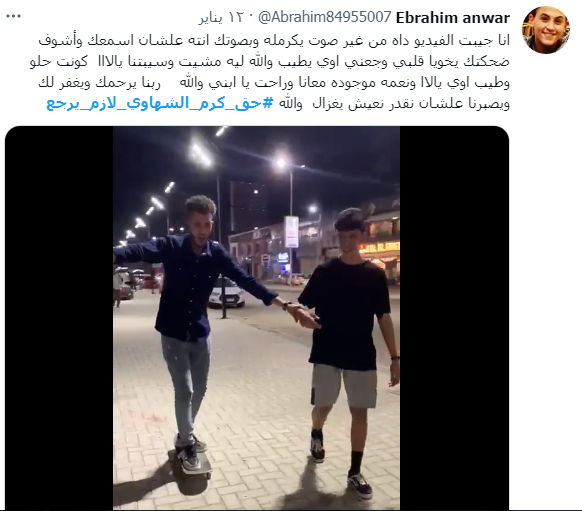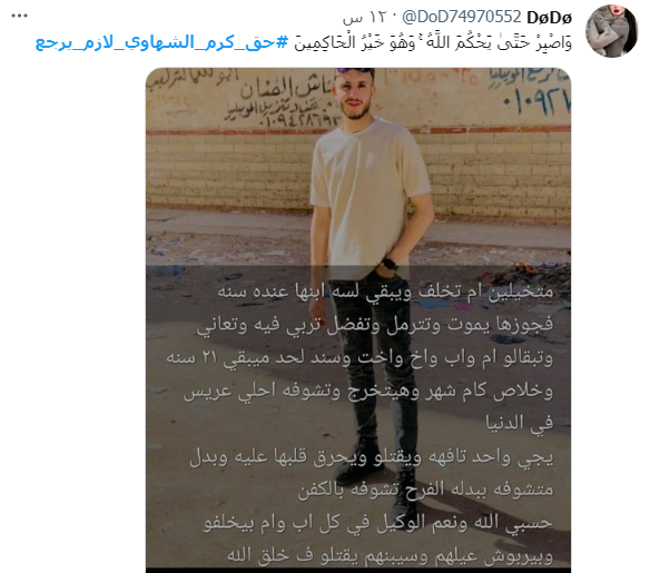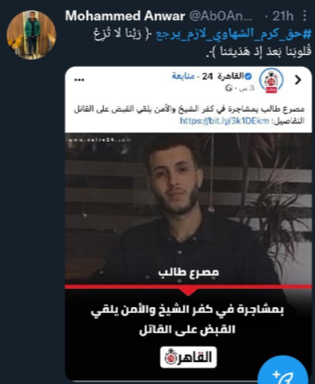 حق كرم الشهاوي لازم يرجع.. ترند في تويتر عقب ظهور والدة شاب كفر الشيخ على القاهرة 24