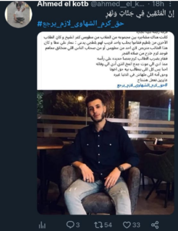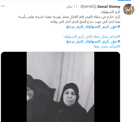 تفاعل المواطنون على موقعي التواصل الاجتماعي فيس بوك وتويتر، على قضية مقتل الطالب كرم محمد الشهاوي، والذي لقي مصرعه يوم الأحد الماضي عقب صلاة الفجر وعقب خروجه من المسجد، بعد أن تعدى عاطل عليه بالضرب على الرأس بإصابة تسببت في وفاته بعدها بساعات.