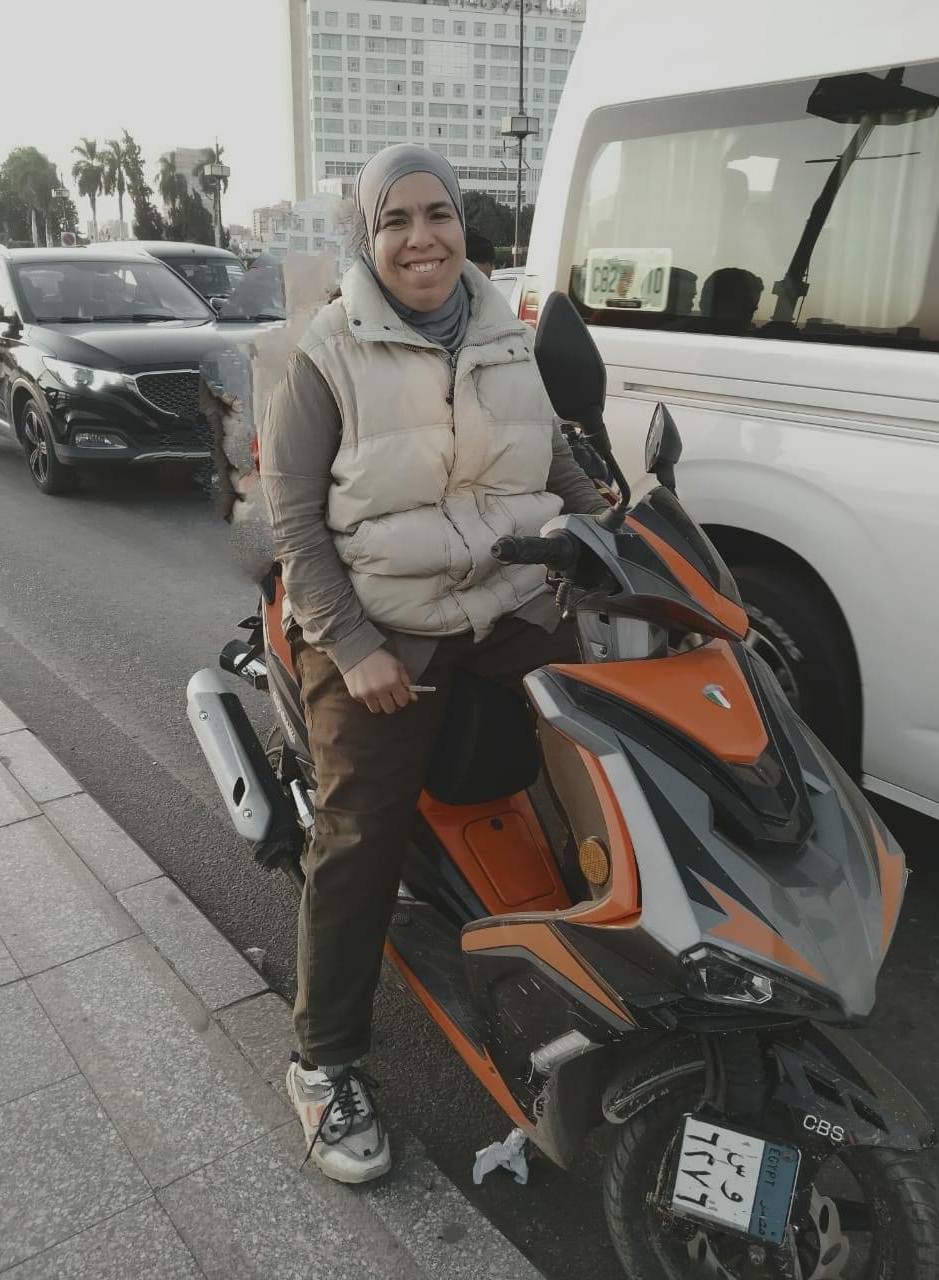 وتكمل: تعلمت قيادة السكوتر بسهولة لأني كنت بركب عجلة قبل كده وفاهمة التوازن، مشيرة إلى أنها تعلمت على يد سيدة متخصصة في تعليم السيدات قيادة السكوتر.