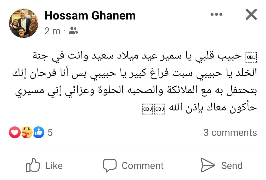 وفى ذكرى ميلاد سمير غانم كتب حسام غانم عبر حسابه الشخصي بموقع فيس بوك: حبيب قلبي يا سمير، عيد ميلاد سعيد وأنت في جنة الخلد يا حبيبي، سيبت فراغ كبير يا حبيبي بس أنا فرحان إنك بتحتفل مع الملائكة والصحبة الحلوة، وعزائي إن مسيري هكون معاك بإذن الله.