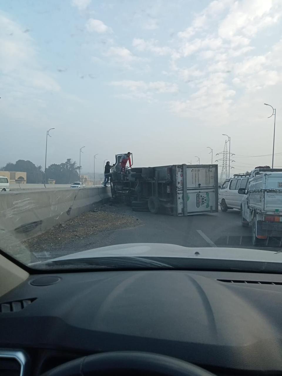 انقلاب سيارة نقل إثر اصطدامها بملاكي أعلى كوبري الوالدة بحلوان │صور
