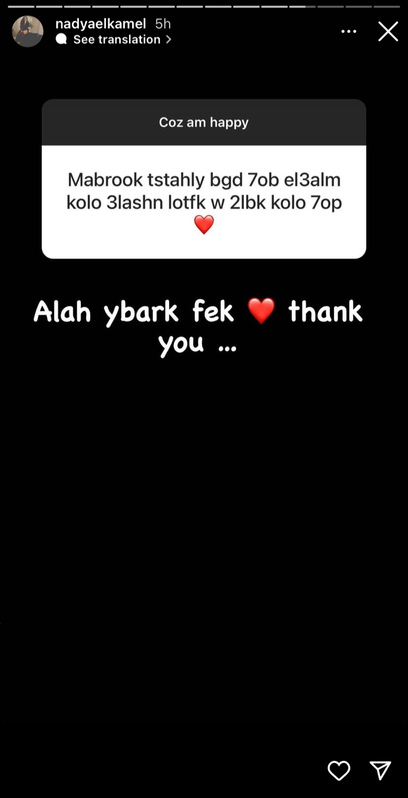 وأكدت ندى الكامل في سؤال آخر - جاء من متابعيها؛ تضمن: ممكن أخطف قلبك، لتقول الأخيرة: قلبي اتخطف، ومن ثم تتوالى رسائل التهنئة لها، بعد إعلان ارتباطها بشكل جديد.