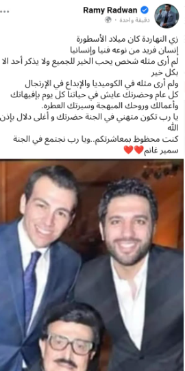 وأضاف رامي رضوان: كل عام وحضرتك عايش في حياتنا كل يوم بإفيهاتك وأعمالك وروحك المبهجة وسيرتك العطرة.. يا رب تكون متهني في الجنة حضرتك وأغلى دلال بإذن الله.. كنت محظوظ بمعاشرتكم.. ويارب نجتمع في الجنة.. سمير غانم.