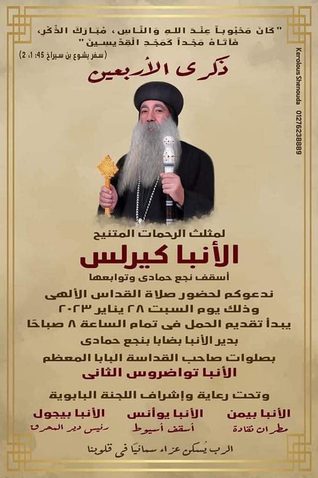 أعلنت مطرانية نجع حمادي، تفاصيل إقامة صلاة الأربعين للراحل الأنبا كيرلس أسقف نجع حمادي.