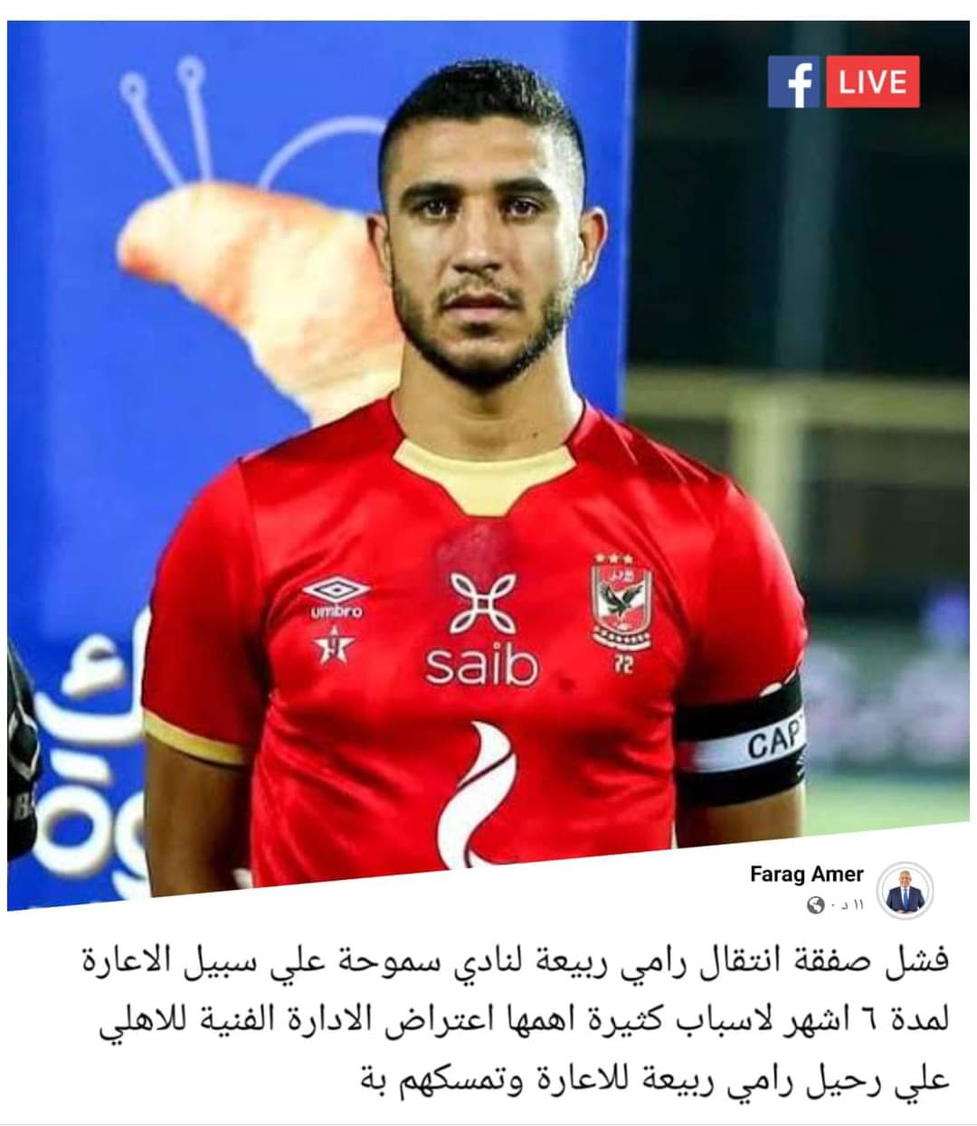 وكتب رئيس نادي سموحة عبر حسابه الشخصي على موقع التواصل الاجتماعي: فشل صفقة انتقال رامي ربيعة لنادي سموحة على سبيل الإعارة لمدة 6 أشهر، لأسباب كثيرة أهمها اعتراض الإدارة الفنية للأهلي على رحيل رامي ربيعة للإعارة، وتمسكهم به.
