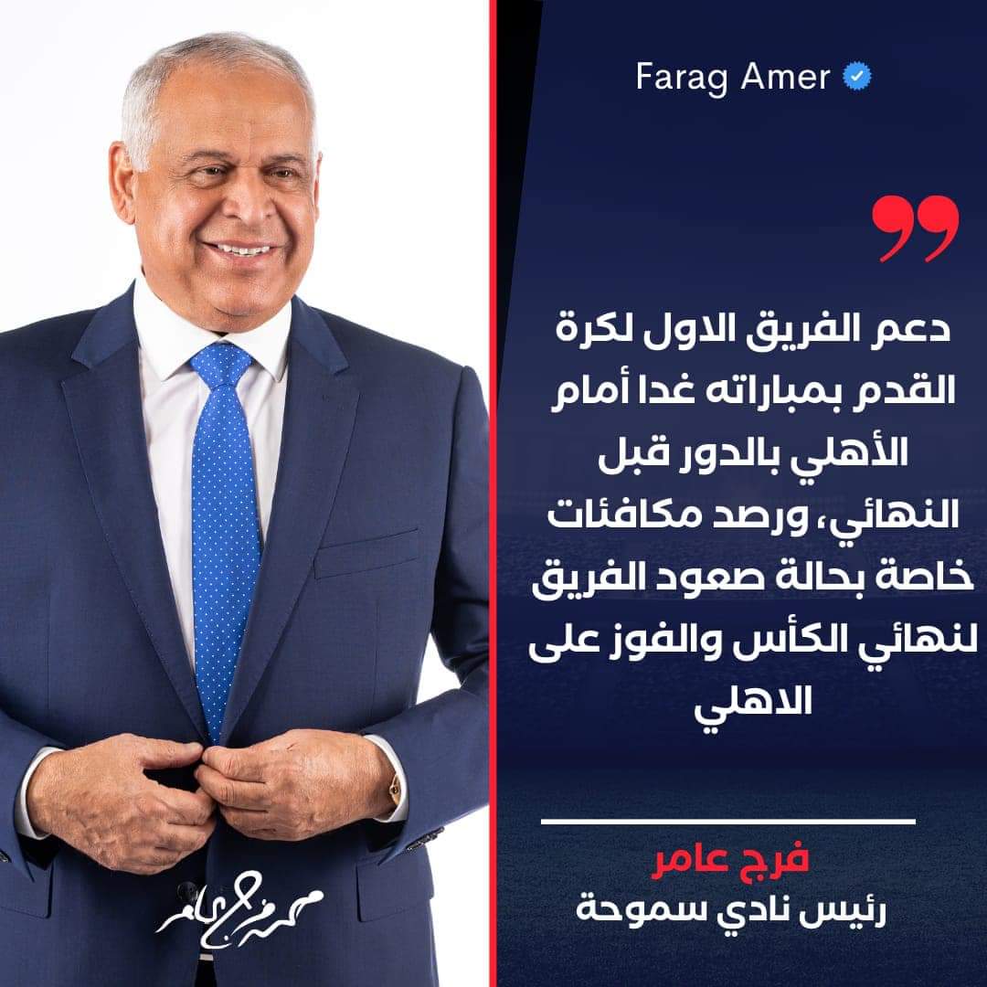 في سياق آخر، كتب فرج عامرعبر تويتر: ندعم الفريق الأول لكرة القدم في مباراته غدًا أمام الأهلي في الدور قبل النهائي، ورصد مكافآت خاصة في حالة صعود الفريق إلى نهائي الكأس، والفوز على الأهلي.
