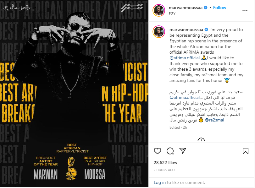 ونشر مروان موسى صوره على موقع تبادل الصور والفيديوهات إنستجرام، يعرب فيها عن سعادته بتمثيله للراب المصري في جائزة Afrima Music Awards Event العالمية، إذ علق: سعيد جدًا بفوزي بـ 3 جوائز في تكريم Afrima Music، وشرف ليا إني أمثل مصر والراب المصري في قارة إفريقيا العريقة، أحب أشكر جمهوري العظيم على الدعم الدائم، وأشكر كل عيلتي وفريقي فريق رقص مال.