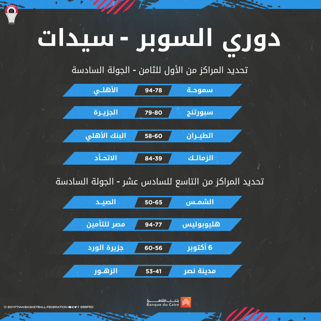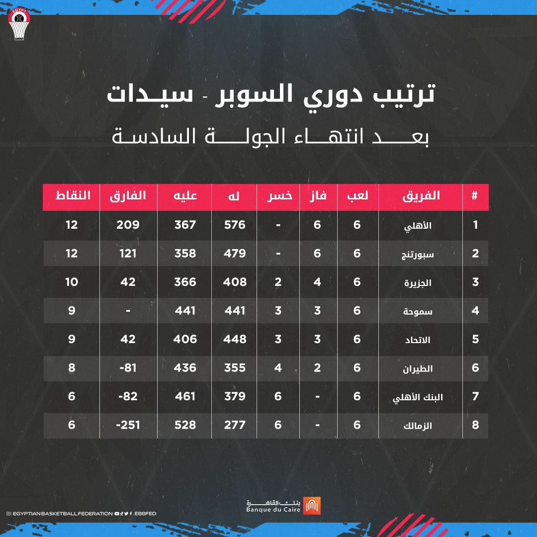 تصدر الفريق الأول لكرة السلة سيدات بالنادي الأهلي جدول ترتيب المسابقة عقب نهاية الجولة السادسة من منافساتها، فيما تذيل جدول الترتيب فريق الزمالك برصيد 6 نقاط.