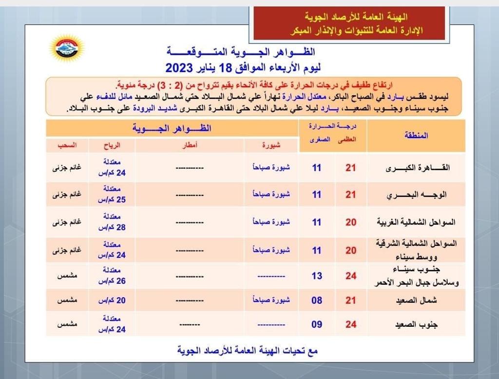 وكشفت هيئة الأرصاد في بيانها، أن القاهرة الكبرى والوجه البحري، تشهد شبورة مائية في الصباح، ورياح معتدلة بسرعة 24 كم\س على القاهرة، و25 كم\س على الوجه البحري، وجو غائم جزئيا.