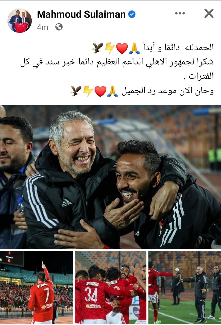 وكتب كهربا عبر صفحته على موقع التواصل الاجتماعي، فيسبوك: الحمد لله دائمًا وأبدً.. شكرًا لجمهور الأهلي الداعم العظيم، دائما خير سند في كل الفترات.. وحان الآن موعد رد الجميل.