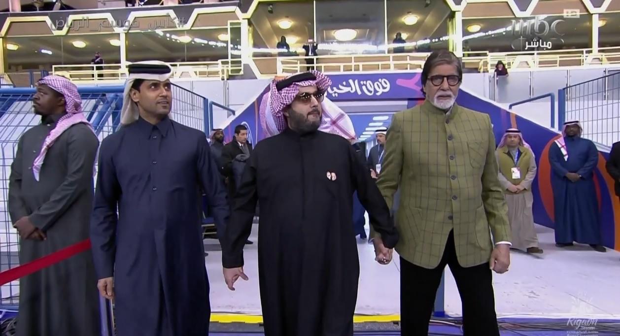 وظهر أميتاب باتشان برفقة المستشار ترك آل الشيخ، رئيس هيئة الترفيه السعودية، في المباراة، وتفاعل الجمهور معه بالتحية.