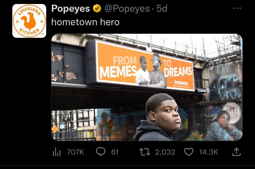 وأعلنت سلسلة مطاعم بوبايز، هذا الشهر عن أن ديونرسيت كولين أصبح الوجه الإعلامي لها، بعد توقيع عقود التعاون الأسبوع الماضي، كما ارتفعت أول لوحة إعلانية لبوبايز تضم كولين خلال الأيام القليلة الماضية، وهو يحاكي تعبيره البالغ من العمر 9 سنوات حاملًا مشروب بوبايز في يده.