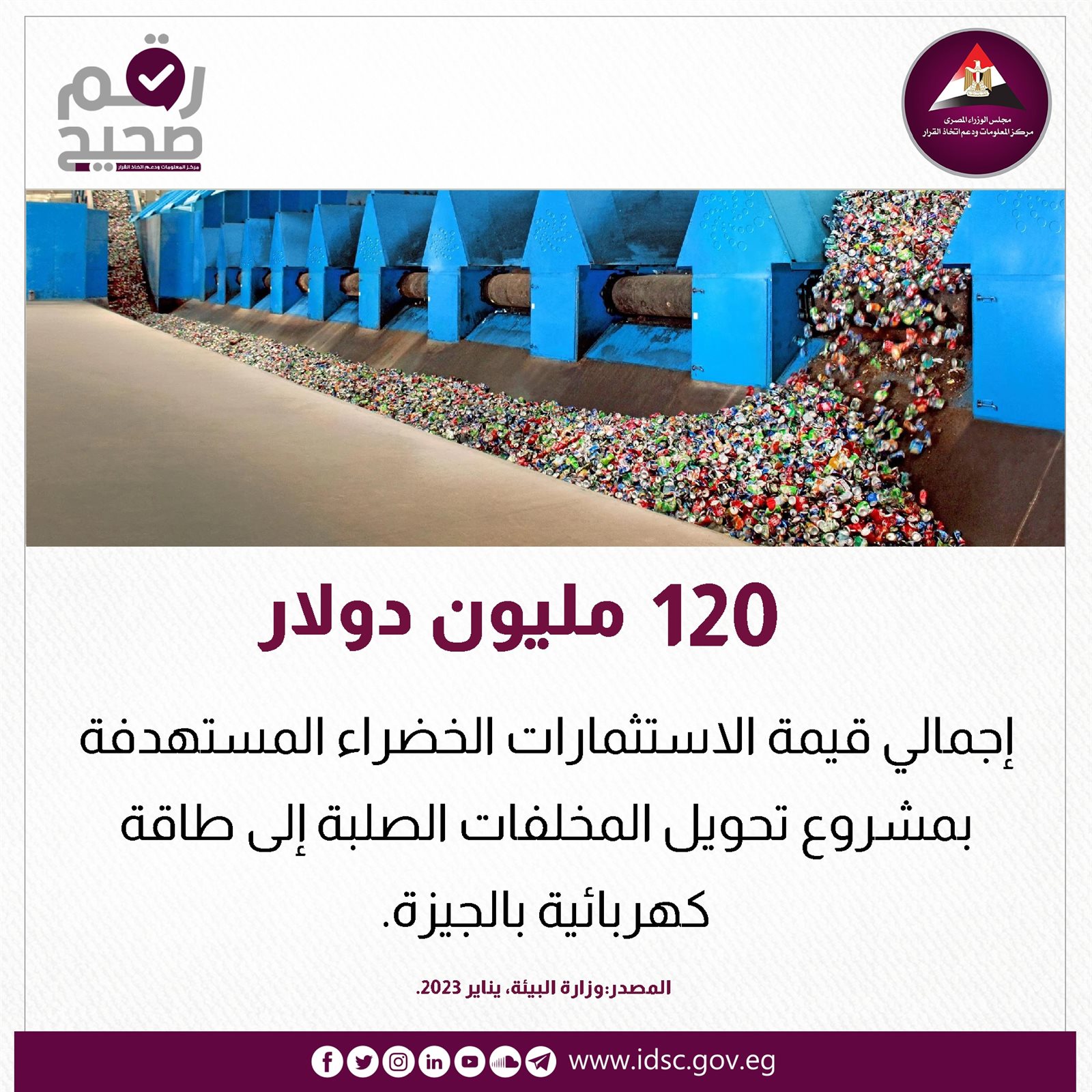 نشر مركز المعلومات ودعم اتخاذ القرار التابع لـ مجلس الوزراء، إنفوجراف، أكد من خلاله أن 120 مليون دولار هي إجمالي قيمة الاستثمارات الخضراء المستهدفة بمشروع تحويل المخلفات الصلبة إلى طاقة كهربائية بالجيزة.