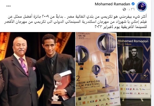 وكتب محمد رمضان عبر حسابه بموقع فيس بوك: أكتر شيء بيفرحني هو تكريمي من بلدي الغالية مصر.. بدايةً من 2009 جائزة أفضل ممثل عن فيلم احكي يا شهرزاد من مهرجان الإسكندرية السينمائي الدولي إلى تكريمي من مهرجان الأقصر للسينما الإفريقية يوم 4 فبراير 2023.