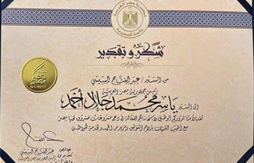 وجاءت شهادة التقدير كالتالي: شكر وتقدير من السيد الرئيس عبد الفتاح السيسي، رئيس جمهورية مصر العربية إلى السيد ياسر محمد جلال أحمد، تقديرًا لدوره الوطني ودعمه لمشروعات صندوق تحيا مصر مع أطيب التنميات بدوام التوفيق.
