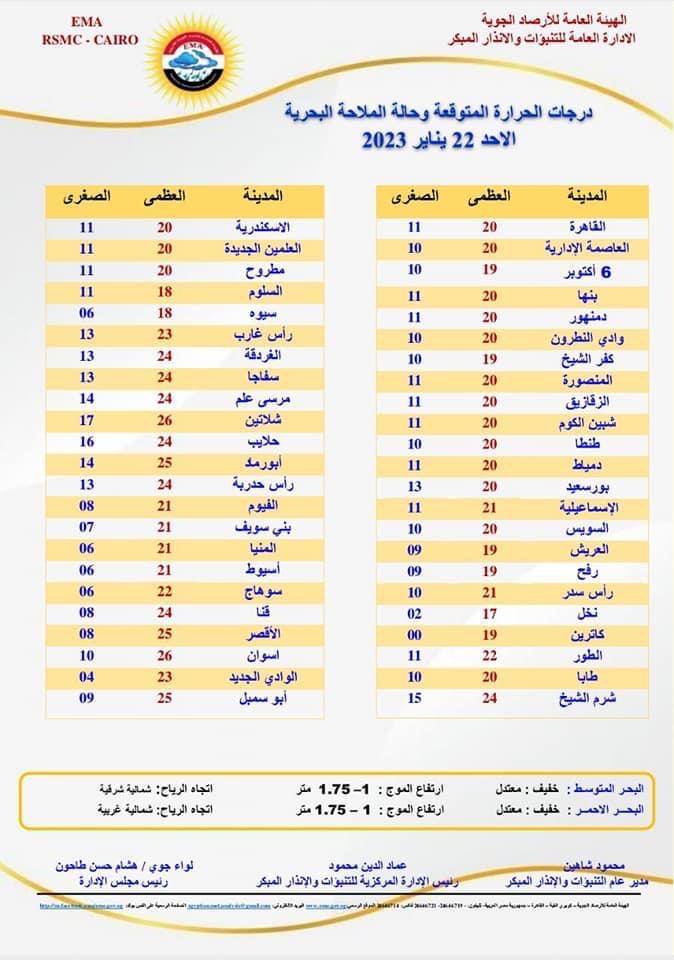 وواصلت هيئة الأرصاد في البيان، أن شمال الصعيد قد تشهد شبورة مائية كثيفة في الصباح، ورياح معتدلة بسرعة 22 كم\س، وجو مشمس، بينما تكون سرعة الرياح على جنوب الصعيد 26 كم\س.