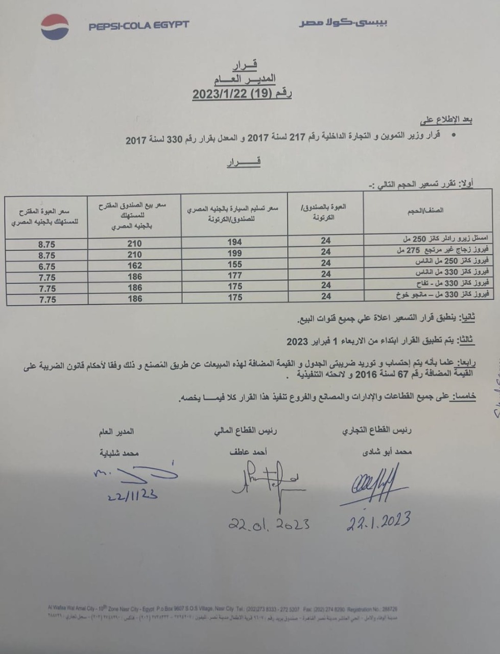 ووفق المستند سيتم زيادة سعر كانز فيروز 250 ملي إلى 6.75 جنيه، وزيادة سعر كانز فيروز 330 ملي إلى 7.75 جنيه، سعر تسليم إلى محلات البقالة والمتاجر في مصر.