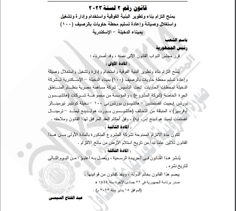 وجاء في عدد الجريدة، بأنه يمنح التزام بناء وتطوير البنية الفوقية واستخدام وإدارة وتشغيل واستغلال وصيانة وإعادة تسليم محطة حاويات بالرصيف 100 بميناء الدخيلة - الإسكندرية لشركة الدخيلة لمحطات الحاويات - تحت التأسيس - شركة مساهمة مصرية بنظام المناطق الحرة الخاصة شركة المشروع، والمؤسسة من مجموعة شركات هاتشيسون بورتس ايجيبت انفستمنتس - هاتشيسون بورتس بي 100 - دخيلة كونتينر تيرمينالز أوفرسيز)، المنبثقة من التحالف (هاتشيسون بوت هولدينج ليمتد - ترمينال انفستمنت ليميتد هولدينج إس إيه، وفق أحكام العقد المرافق لهذا القانون وملاحقه.