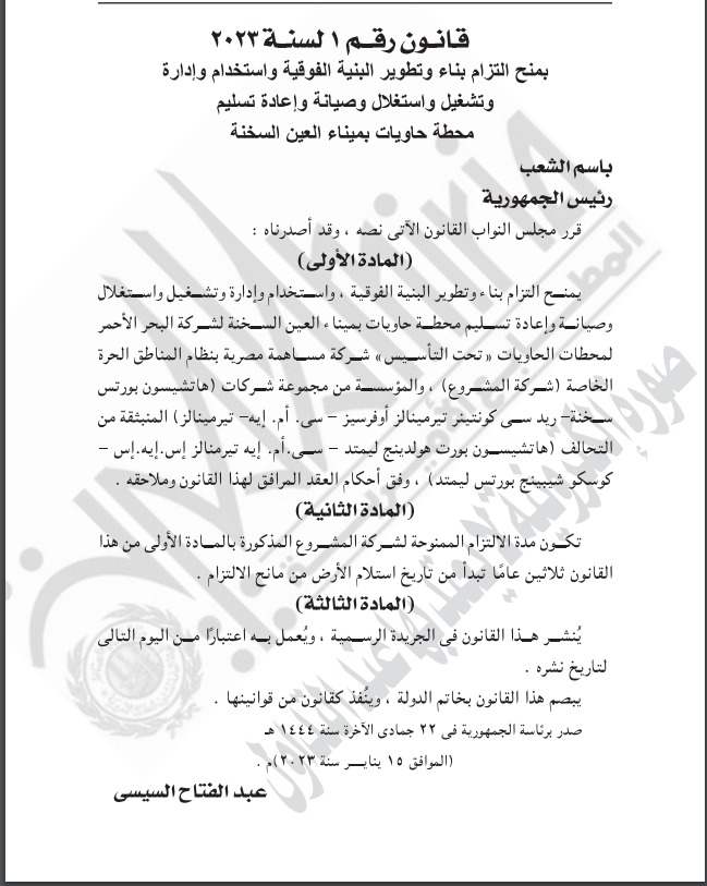 ونص قرار الرئيس عبد الفتاح السيسي، بأن يمنح التزام بناء وتطوير البنية الفوقية، واستخدام وإدارة وتشغيل واستغلال وصيانة وإعادة تسليم محطة حاويات بميناء العين السخنة لشركة البحر الأحمر المحطات الحاويات، تحت التأسيس شركة مساهمة مصرية، بنظام المناطق الحرة الخاصة شركة المشروع، والمؤسسة من مجموعة شركات هاتشيسون بورتس د سى كونتينر تيرمينالز أوفرسيز - سي. أم. إيه تيرمينالز، المنبثقة من التحالف هاتشيسون بورت هولدينج ليمتد - سى. أم. إيه تيرمنالز إس.إيه إس - كوسكو شيبينج بورتس ليمتد، وفق أحكام العقد المرافق لهذا القانون وملاحقه.