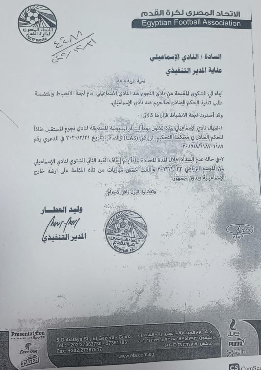 يأتي ذلك تنفيذًا لقرار لجنة الانضباط بالاتحاد المصري لكرة القدم الصادر في 21 ديسمبر 2022 ضد النادي الإسماعيلي، ومنحه مهلة لمدة ثلاثون يومًا انتهت بتاريخ أمس 22 يناير 2023، وذلك لتنفيذ حكم المحكمة الرياضية الدولية (CAS) الصادر ضده لصالح نادي النجوم لكرة القدم خلال المهلة المحددة.