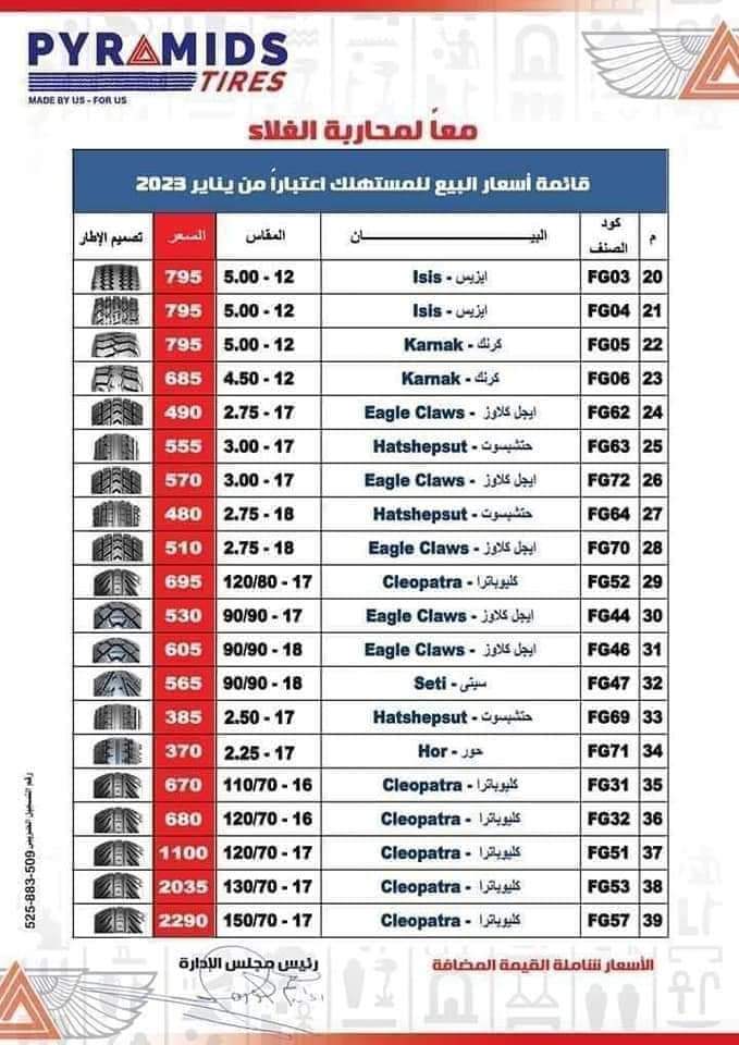 وفيما يلي قائمة أسعار إطارات شركة بيراميدز المتوفرة حاليًا لدى الشركة، حيث تبدأ من 370 جنيه مصري: