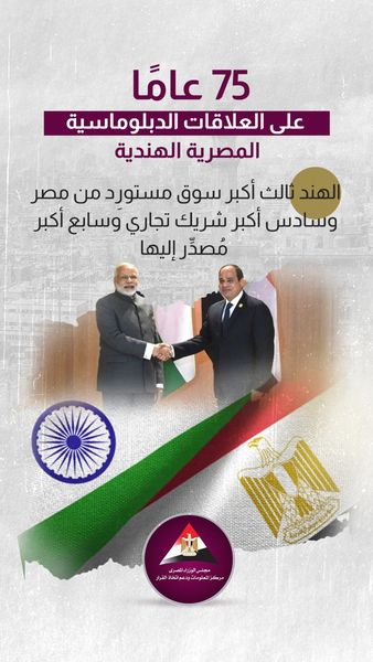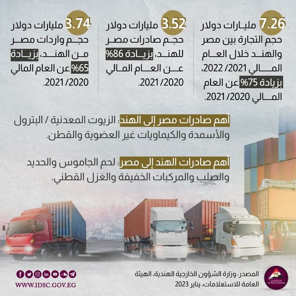 نشر مركز المعلومات ودعم اتخاذ القرار التابع لـ مجلس الوزراء إنفوجراف، سلط الضوء من خلاله على حجم التبادل التجاري والتعاون الاقتصادي، بين مصر والهند، والذي يأتي في ضوء دعوة الرئيس عبد الفتاح السيسي من رئيس الوزراء الهندي، للتوجه إلى الهند على رأس وفد يضم وزراء ومسؤولين آخرين في زيارة رسمية تستغرق 3 أيام.