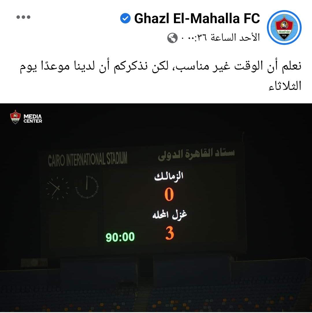 وكانت الصفحة الرسمية لنادي غزل المحلة وجهت رسالة عقب هزيمة الزمالك أمام الأهلي بثلاثية نظيفة، كان محتواها كالتالي: نعلم أن الوقت غير مناسب، لكن نذكركم أن لدينا موعدًا يوم الثلاثاء.