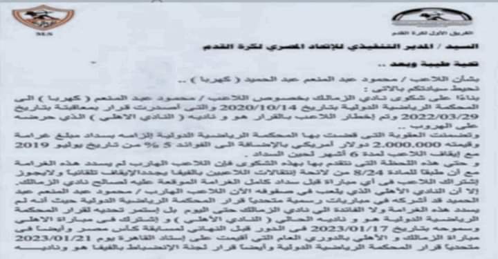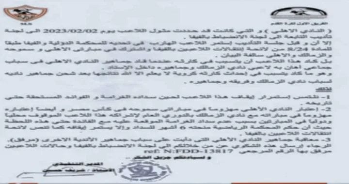 وفي وقت سابق، كشف الاتحاد المصري لكرة القدم برئاسة جمال علام، وجود شكوتين تم تسليمها للجنة الانضباط بالاتحاد.