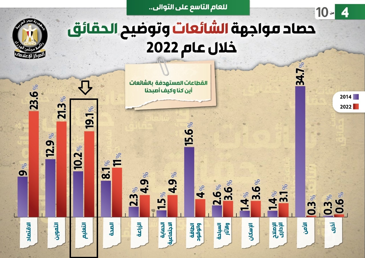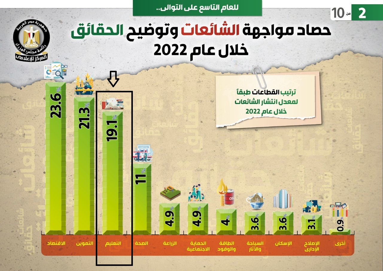 من بين قطاعات الحكومة المختلفة، كان لـ وزارة التربية والتعليم والتعليم الفني، نصيب الأسد في الشائعات المكررة، وذلك وفقًا لتقرير صادر عن مجلس الوزراء، بالشائعات التي واجهت مصر خلال عام 2022، حيث طارد قطاع التعليم 19.1 % من الشائعات التي لاحقت الحكومة.