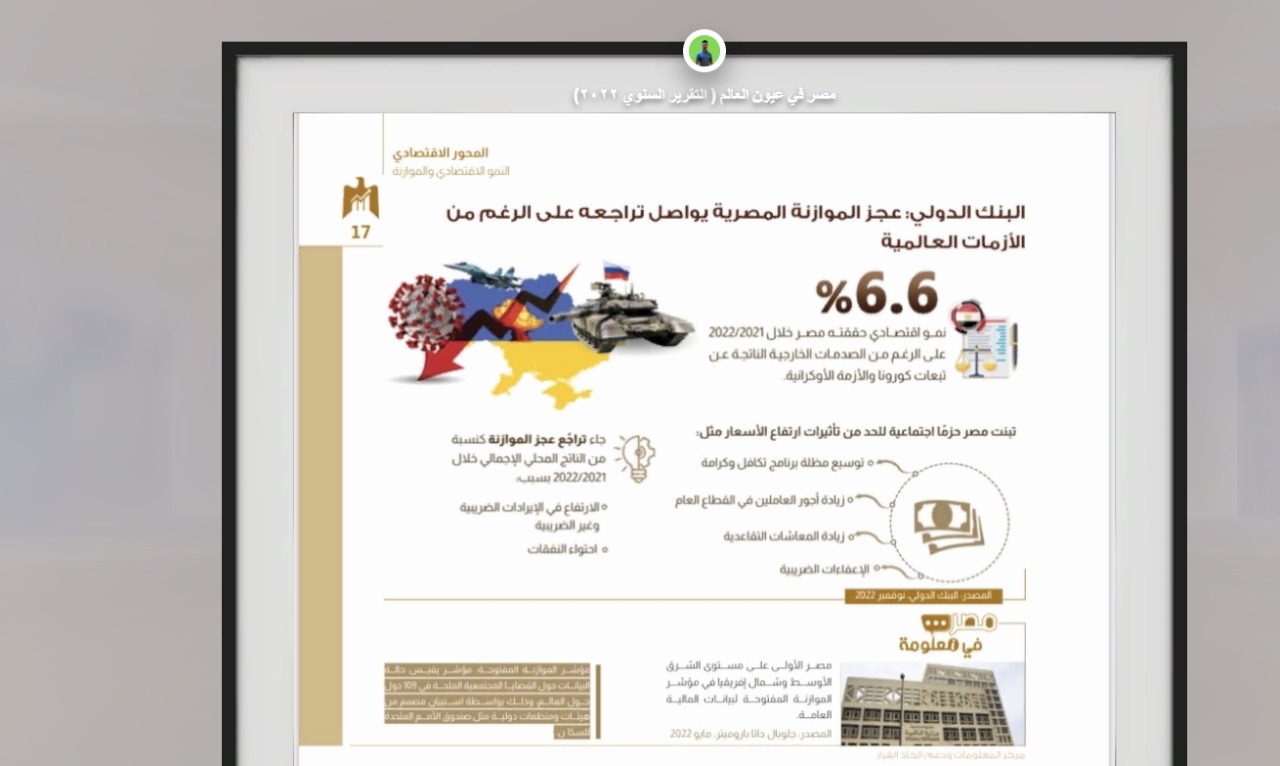 أطلق مركز المعلومات ودعم اتخاذ القرار بـمجلس الوزراء، نسخة افتراضية من إصداره السنوي مصر في عيون العالم، اعتمادًا على تقنيات الميتافيرس، وذلك تزامنًا مع إطلاق النسخة الخامسة من الإصدار الذي رصد تطور أداء مصر في عدد من المجالات التنموية خلال عام 2022، من واقع المؤشرات والتقارير الخاصة بـ 60 مؤسسة دولية وإقليمية.