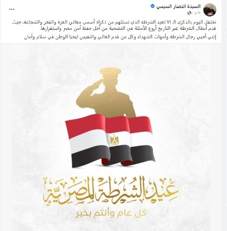 وقالت السيدة انتصار السيسي، في منشور لها على صفحتها الرسمية بموقع التواصل الاجتماعي فيس بوك: نحتفل اليوم بالذكرى الـ 71 لعيد الشرطة الذي نستلهم من ذكراه أسمى معاني العزة والفخر والشجاعة، حيث قدم أبطال الشرطة عبر التاريخ أروع الأمثلة في التضحية من أجل حفظ أمن مصر واستقرارها.